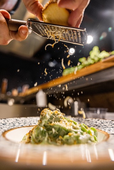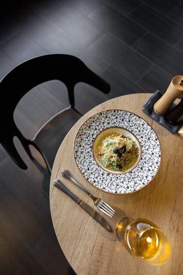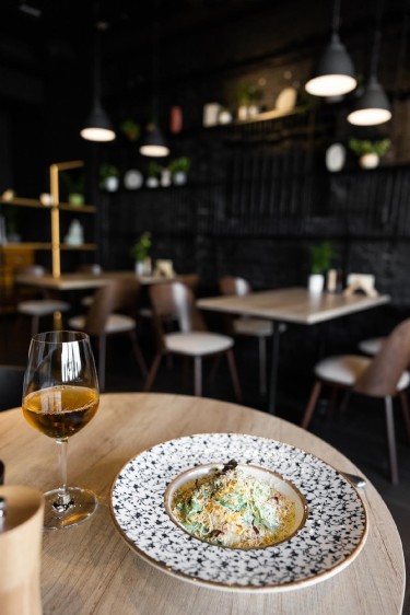 Сердцем «Пастаря» является открытая паста-станция, превращающая приготовление свежей пасты вручную за мраморной столешницей в настоящий театр. Пространство заведения дышит современным урбанизмом с индустриально-лофтовыми нотками, выраженными через открытые коммуникации, бетонные акценты и строгие металлические светильники или стулья. Контраст и уют создаются обильным использованием натурального дерева на столах, барной стойке и в декоре, дополненного теплой подсветкой и терракотовыми или охристыми акцентами, добавляющими средиземноморского тепла. Философия интерьера — это современный минимализм с чистыми линиями и функциональной мебелью без излишев, где отсутствие вычурного декора фокусирует внимание исключительно на еде и процессе ее создания. Пространство оживляют растения в горшках, вносящие свежие зеленые акценты в урбанистическую среду. Ключевым функциональным элементом служит просторная барная стойка, предназначенная не только для ожидания, но и для быстрого перекуса, аперитива, дижестива и наблюдения за ритмом заведения.